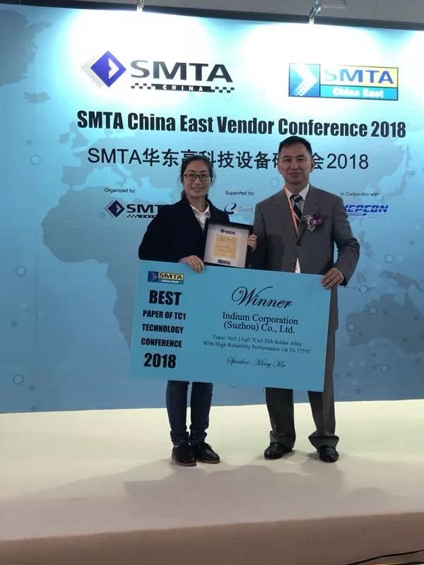 在第二十八屆中國(guó)國(guó)際電子生產(chǎn)設(shè)備暨微電子工業(yè)展(NEPCON China)期間,我們斬獲了多項(xiàng)大獎(jiǎng)。我們的Indium10.1HF 焊錫膏榮獲了SMT China 遠(yuǎn)見獎(jiǎng)(SMT China Vision Award)和EM Asia 創(chuàng)新獎(jiǎng)(EM Asia Innovation Award),此外,我們的化學(xué)研究員馬麗榮獲SMTA華東高科技技術(shù)研討會(huì)2018的最佳論文獎(jiǎng)。(論文詳情參見此處)
