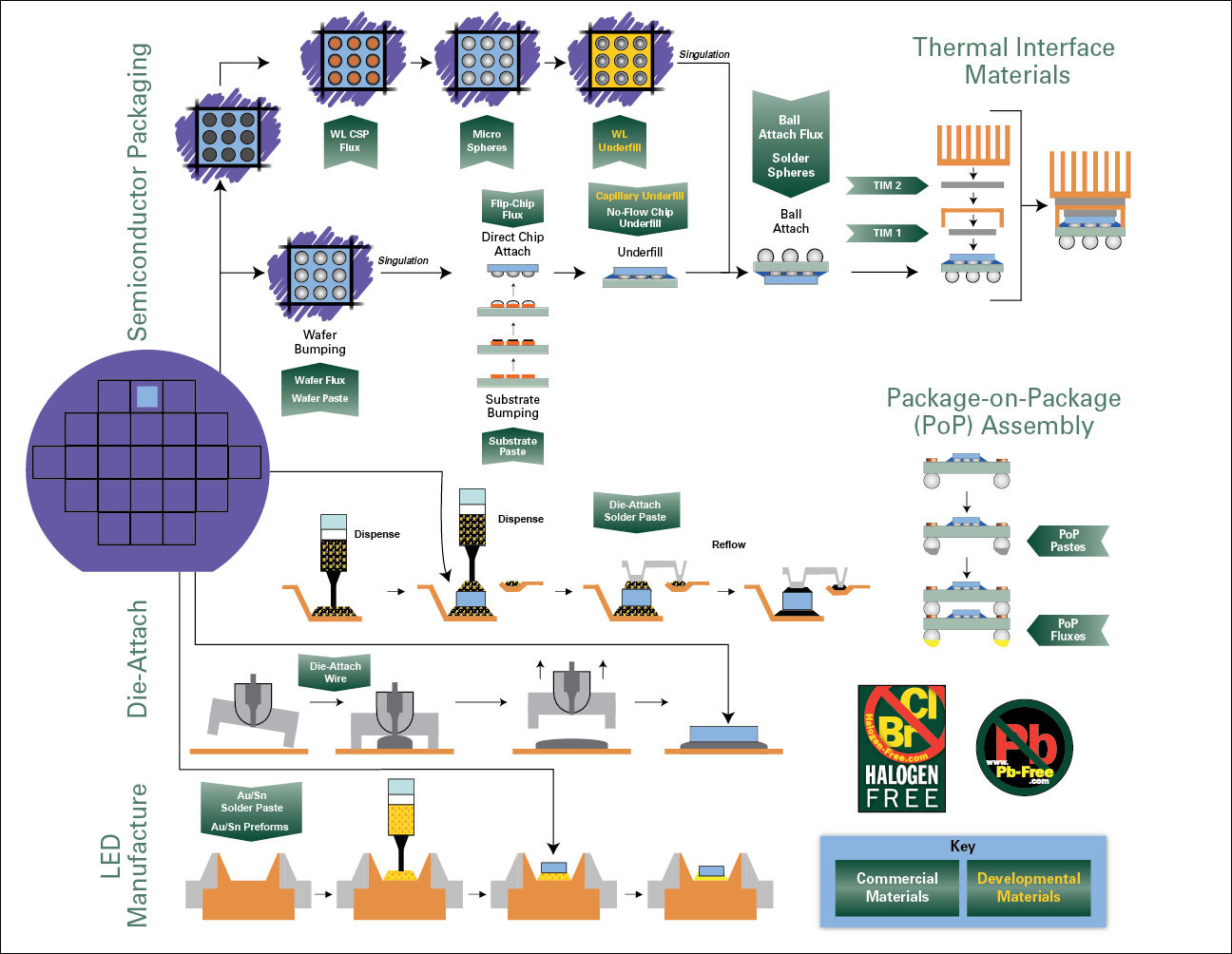 半導(dǎo)體和高級裝配材料(SAAM)是為了半導(dǎo)體芯片能夠與外界進(jìn)行通信設(shè)計的。銦泰公司的產(chǎn)品被用于制造移動設(shè)備(例如移動電話和平板電腦),電腦游戲機(jī)、汽車電子、航空電子、服務(wù)器和可再生能源的功率控制設(shè)備等器件。