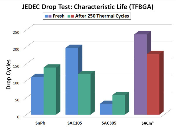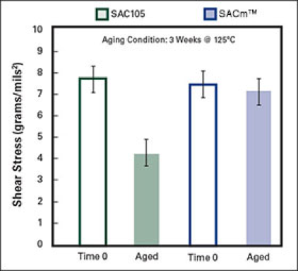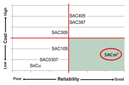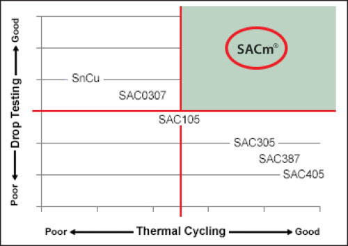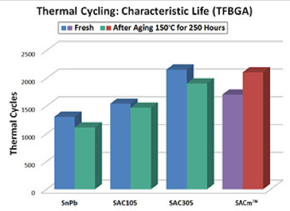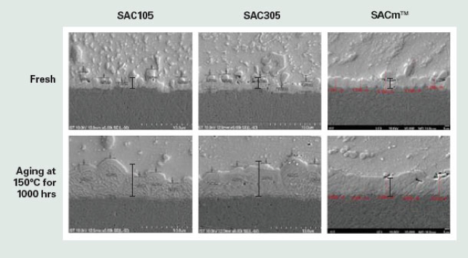 添加了錳的SACm?可靠性不會(huì)降低。SACm?合金中減少了銀的含量。這樣既降低了材料成本,又提高了熱循環(huán)可靠性,使SACm?能很容易地被應(yīng)用到現(xiàn)有的無鉛工藝中。